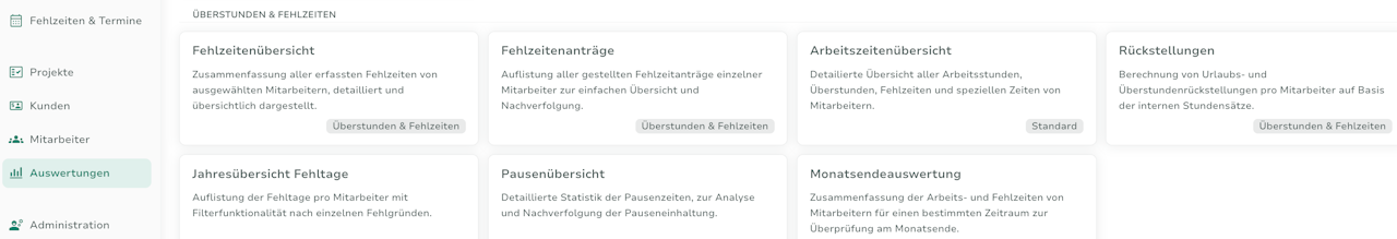 Unter Auswertungen > Mitarbeiter können Administratoren über alle Mitarbeiter Auswertungen erstellen: Fehlzeitenübersicht, Fehlzeitenanträge, Arbeitszeitenübersicht, Jahresübersicht Fehltage, Pausenübersicht und Monatsendeauswertung. Außerdem ändert sich hier die Auswertung "Beschäftigungsgrad" zu Verfügbarkeitsgrad.